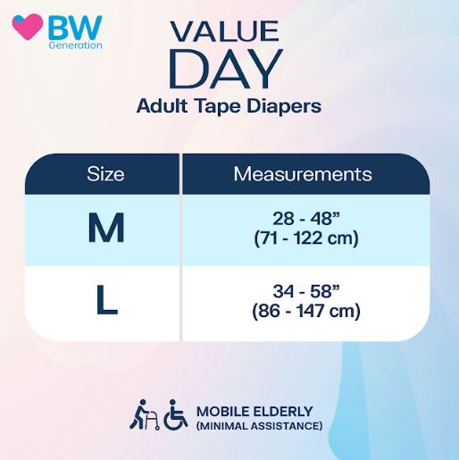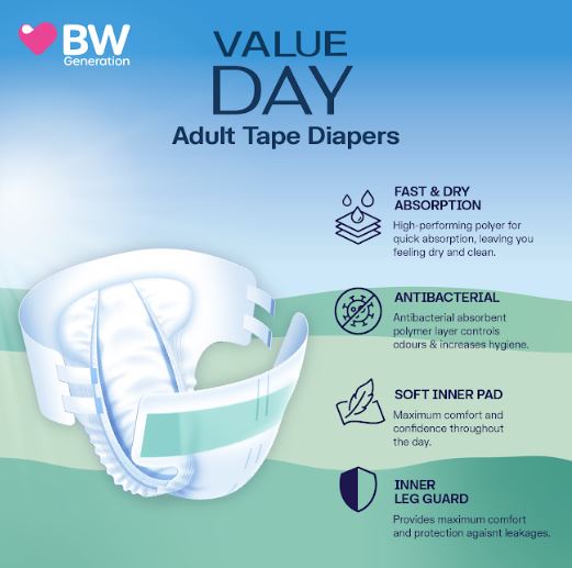 VALUE DAY ADULT DIAPERS is a softer alternative for contemporary PE (plastic) diapers. The soft inner pad provides comfort and confidence for everyday use. High absorbency (up to 1700ml) and double absorbent core allows for rapid absorption leaving you feeling dry and clean all day.