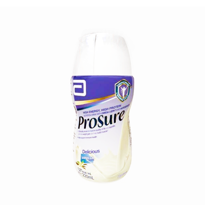 Prosure is a 1.25 kcal/ml high protein, complete balanced liquid supplement enriched with omega 3 fatty acids and antioxidants. Prosure has increased levels of vitamin E and C, folic acid, magnesium, phosphorus and zinc. Prosure also contains fibre and fructooligosaccharides.
