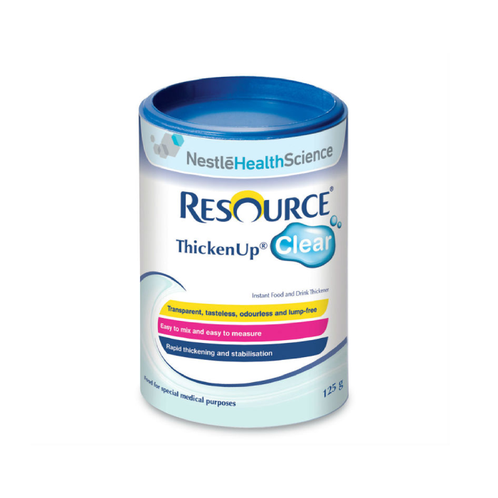 Resource® ThickenUp® Clear is a thickener for people with Dysphagia (swallowing difficulties) made from Xanthum gum instead of starch. When added to any food or beverages, it thickens quickly and does not alter the taste and color. Water thickened remains clear and free of lumps. It is easy to dose and thickens rapidly. It will not continue to thicken and gets diluted after some time passes between preparation and serving.