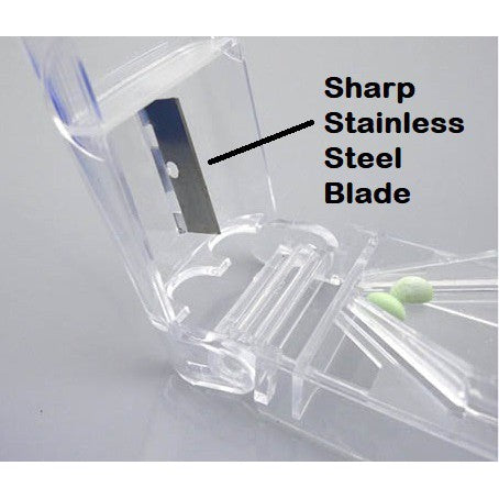 The pill splitter has built-in pill compartments to properly store pills after each cut. The medication aid safely splits tablets or pills up to ½" in diameter.